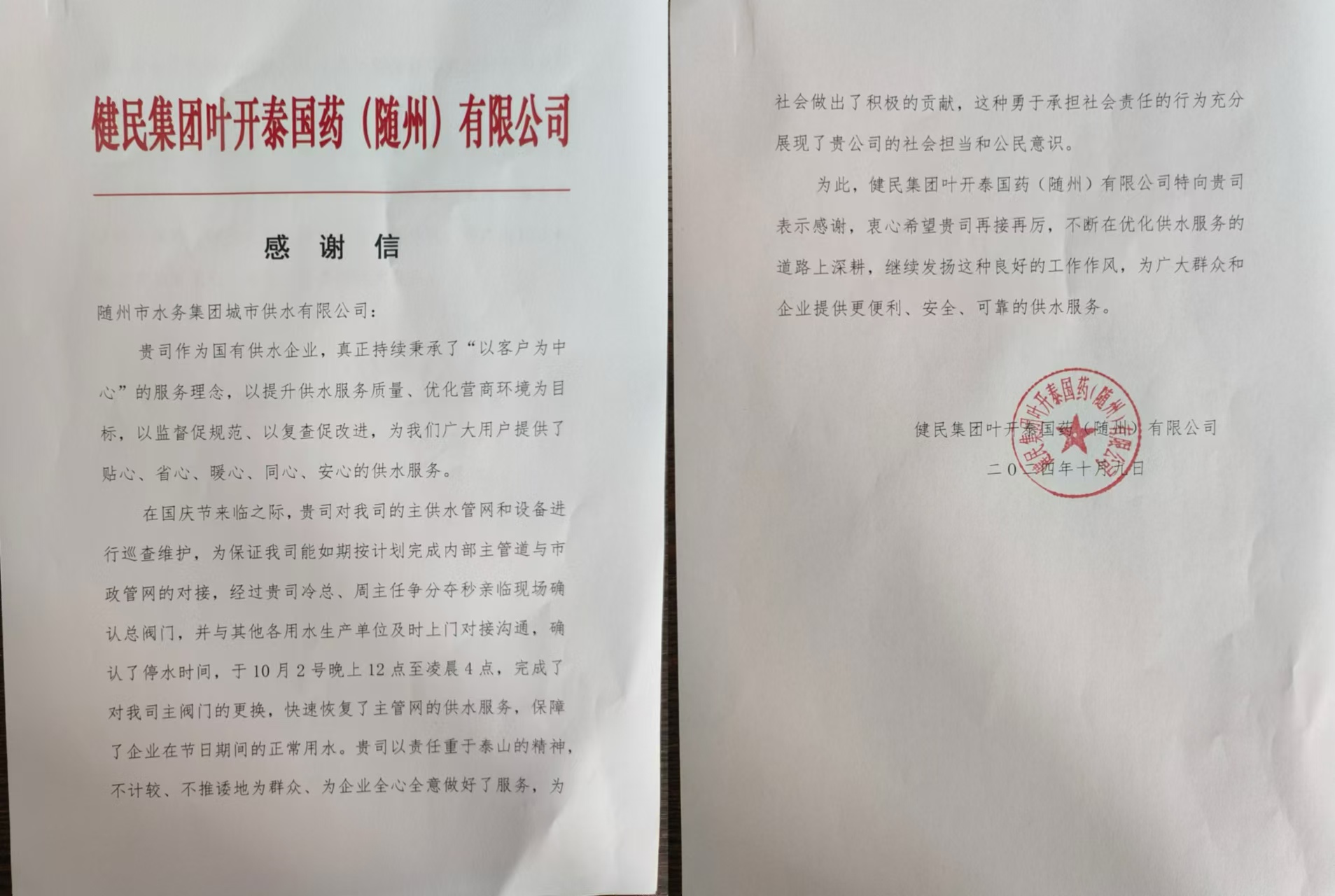 “排憂解難及時 供水服務(wù)周到”,近日,健民集團(tuán)葉開泰國藥(隨州)有限公司專程到隨州市水務(wù)集團(tuán)下屬子公司城市供水有限公司送上一面承載誠摯謝意的錦旗和一封感謝信,他們用最質(zhì)樸、最真摯的方式,對公司運(yùn)維人員熱情、高效、便捷、暖心的服務(wù)表示誠摯感謝。