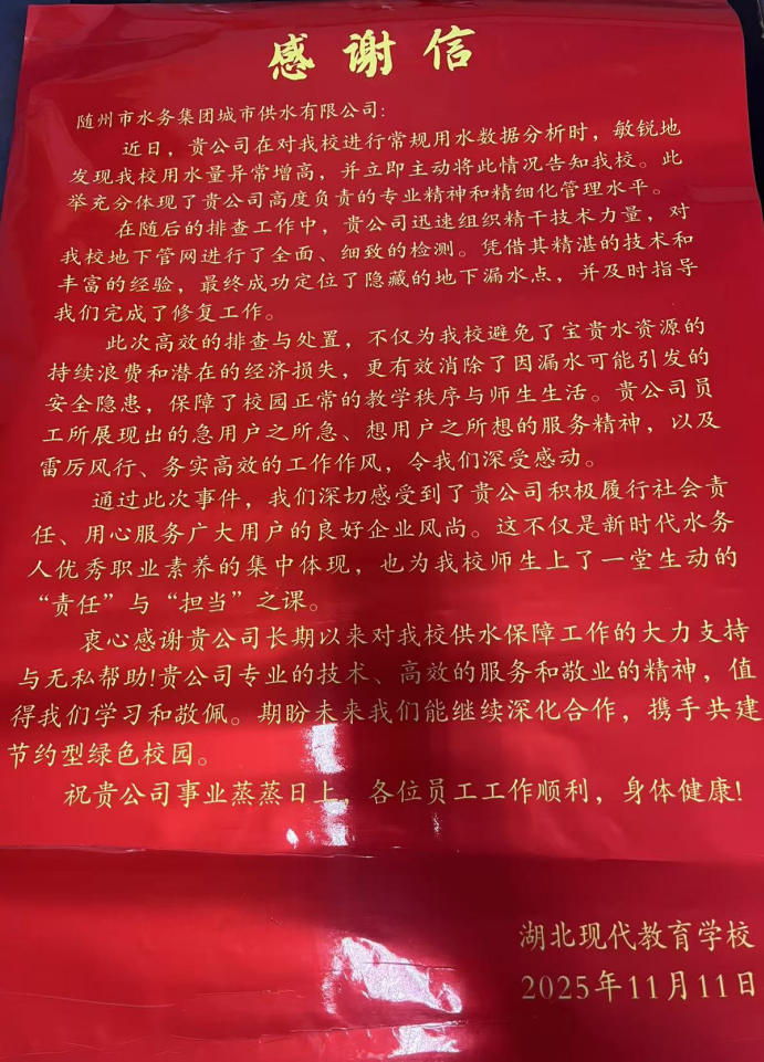 一面鐫刻著“明察秋毫堵漏點,傾心服務(wù)暖師生”的鮮紅錦旗,隨同滿載深情的感謝信,被湖北現(xiàn)代教育學(xué)校負(fù)責(zé)人鄭重送到隨州市水務(wù)集團城市供水公司。紙短情長,字里行間飽含對公司快速解決校園供水困境的誠摯謝意。